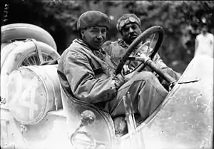 At Peugeot, the three driver-engineers Georges Boillot, Jules Goux and Paolo Zuccarelli (dubbed “The Charlatans”[6]) had worked with Ernest Henry and produced their first design. Fellow Peugeot-engineer Ettore Bugatti had also produced a design and the two had a run-off. The drivers’ car was comfortably faster, reaching 160 km/h (99 mph), built with a four-cylinder 7.6L engine. The innovative twin-overhead camshaft, with four valves per cylinder, developed 148 bhp revving at 2200rpm.[5][7] This was equivalent to nearly 20 bhp per litre and 50% higher than the performance of its main rival, the Fiat S74, that only gave 13 bhp per litre at a leisurely 1600rpm over its 14.1 litre engine.[8] Although some of the ideas were not new, it was Peugeot that combined them and pioneered the use of hemispherical combustion chambers. There is some evidence that Zuccarelli got the ideas from his former work at Hispano-Suiza and that legal action was taken for breach of patent.[7] The Peugeot engine became the template for race-engines for many years.[9]
