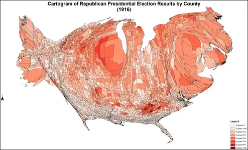 Of the 3,022 counties making returns, Wilson led in 2,039 counties (67.47%). Hughes managed to carry only 976 counties (32.30%), the smallest number in the Republican column in a two-party contest during the Fourth Party System. Two counties (0.07%) split evenly between Wilson and Hughes. Although the Progressive Party had no presidential candidate (just candidates for presidential electors who were unpledged for president), they carried five counties (0.17%), whilst nine counties – 0.30 percent and the same as in 1912 – inhabited either by Native Americans without citizenship or disenfranchised African Americans failed to return a single vote. Wilson carried 200 counties that had never voted Democratic in a two-party contest prior to that time.[26]
