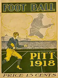 "Although 1918 was a war year, and many problems threatened from time to time to put an end to college athletics., Pitt stuck manfully to the ship and 'Kept the Home Fires Burning'. With the exception of baseball, which was abolished due to lack of interest, hardly directly chargeable to war conditions, the other major sports—football, basketball and track—were kept going."[7] "Football had a hard row to hoe in 1918." Only five games were actually played due to the war and pandemic sweeping the nation. "The usual training trip to 'Camp Hamilton,' Windber, Pa. was dispensed with." The one year residence rule was called off by all the big schools, which helped bolster their rosters since the army had depleted them. After numerous shifts were made to the schedule, due to the government imposed quarantine, only three of the original games scheduled were played -Washington & Jefferson, Penn and Penn State. Georgia Tech was played for the benefit of the War Charities, and was the highlight of the season. $25,000 was donated from the proceeds of the game. Pitt played a post season game against the Cleveland Naval Reserves and lost by one point. "It was a most unsatisfactory game in many ways and marred Pitt's record of straight victories started in 1915."[8]
