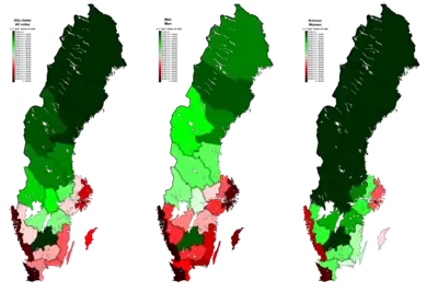 | Kristianstad County | 27,205 | 44.7 | 33,605 | 55.3 | 12,393 | 35.3 | 22,718 | 64.7 | 14,812 | 57.6 | 10,887 | 42.4 |