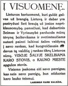 International recognition of the new government did not prove to be difficult.[14] The Western powers were not pleased with the Third Seimas when it ratified the non-aggression treaty with the Soviet Union in September. They were looking for a government that would change the priorities of Lithuanian foreign policy. It was therefore not surprising that the British The Daily Telegraph, the French Le Matin, and the United States' The New York Times wrote that the coup was expected to curtail the move towards friendly relations with the Soviet Union and normalize relations with Poland; the anti-democratic and unconstitutional nature of the coup was not emphasized.[20] The Western press reported the news calmly, or assessed it as a positive development in the Lithuanian struggle against Bolshevism. International diplomatic opinion held that a strong authoritarian leader would provide internal stability, and that even during the earlier years of the republic Lithuania had not been genuinely democratic, since many essential freedoms were curtailed under martial law.[20]