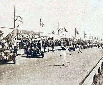 Wealthy gentleman-racer Henri de la Sayette entered the first Citroën to race at Le Mans. His C4 model was fitted with a standard open-top touring body.[20] But its 1554cc engine put it in the 2-litre category with the supercharged Alfa Romeo against which it was badly under-powered. Curiously, for its engine size it was given a lower target distance (147 laps) than the smaller 1490cc Aston Martins (148 laps).[21](See the photograph of the scoreboard below for evidence of car #19)