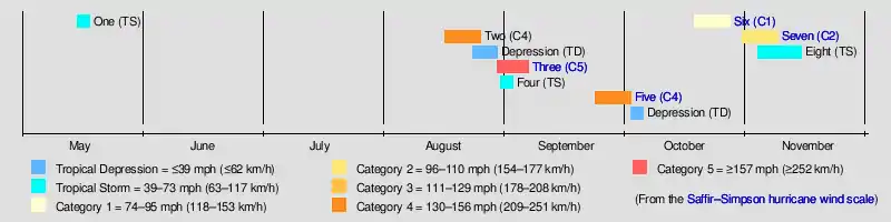 | Seven | October 30 – November 8 | Category 2 hurricane | 105 (165) | 964 | Bahamas, Florida | $5.5 million | 19 | |||