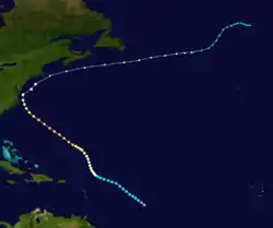 On September 9, ships observed signs of a potentially developing tropical disturbance in the central Atlantic Ocean. The first reports of such convective activity in the area were relayed by the S.S. West Selene at 00:00 UTC that day.[1] Based on this report, tropical cyclogenesis was estimated to have completed by 06:00 UTC on September 8; a reanalysis of the storm conducted in 2012 did not find any justification to alter the date in HURDAT,[nb 1] and as such the initial date of formation remained unchanged.[2] The tropical depression was quick to intensify, and was analyzed to have attained tropical storm strength by 18:00 UTC later that day. At the time, the system was tracking northwestward.[4] The following day, ships continued to report rough seas generated by the storm approximately 250 mi (400 km) east of the Lesser Antilles.[1] On September 10, westerly winds south of the storm's estimated position were reported, confirming the existence of a closed circulation center and justifying the system's classification as a fully-tropical cyclone.[2] Gradual intensification continued, and at 00:00 UTC on September 12, it is estimated that the tropical storm intensified to hurricane intensity. At roughly the same time, the hurricane also began to track a more northerly course.[4]