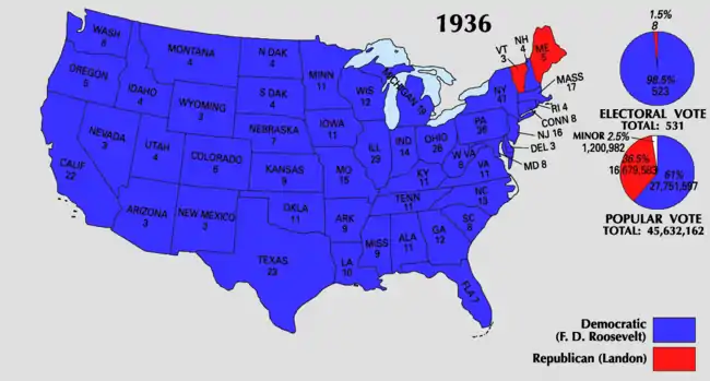 ![]() Presidential election results map. Blue denotes those won by Roosevelt/Garner, red denotes states won by Landon/Knox. Numbers indicate the number of electoral votes allotted to each state. | |||||||||||||||||||||||||||||