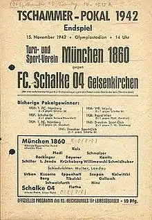 The 1942 Tschammerpokal Final decided the winner of the 1942 Tschammerpokal, the 8th season of Germany's knockout football cup competition. It was played on 15 November 1942 at the Olympiastadion in Berlin.[2] A total of 80,000 spectators watched the match, making it the highest attended German cup final in history. 1860 Munich won the match 2–0 against Schalke 04, to claim their 1st cup title.