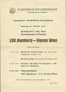 The 1943 Tschammerpokal Final decided the winner of the 1943 Tschammerpokal, the 9th season of Germany's knockout football cup competition. It was played on 31 August 1943 at the Adolf-Hitler-Kampfbahn in Stuttgart.[2] First Vienna won the match 3–2 against LSV Hamburg after extra time, to claim their 1st cup title.