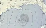 On August 25, Baker weakened to tropical depression status while crossing Cuba, but soon thereafter regained tropical storm intensity in the western Caribbean Sea. Two days later, Baker entered the Gulf of Mexico, and by the next day Baker had regained hurricane status. It turned northward, reaching a peak intensity of 105 mph (169 km/h) on August 30. Baker weakened slightly before making landfall near Gulf Shores, Alabama with winds of 85 mph (137 km/h) on August 31.[6][9] Property and crop damage totaled $2.55 million (1950 USD), primarily between Mobile, Alabama and Saint Marks, Florida.[6] Torrential rainfall fell throughout the region, with the largest total occurring in Caryville, Florida, where 15.49 in (393 mm) of precipitation were recorded.[22] The heavy precipitation was responsible for extensive crop damage across the region. The hurricane also spawned two tornadoes, one of which destroyed four houses and a building in Apalachicola, Florida. In Birmingham, Alabama, high wind downed power lines, which caused one death and two injuries due to live wires. While inland, Baker tracked northwestward and eventually dissipated over southeastern Missouri on September 1.[6][9]