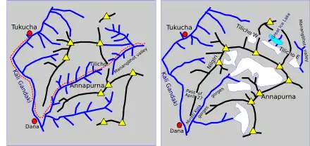 Dhaulagiri and Annapurna are 34 kilometres (21 miles) apart on either side of the gorge of the Kali Gandaki river, a tributary of the Ganges.[10][25] As the expedition approached from the south Dhaulagiri was clearly visible as a white pyramid to the west whereas Annapurna to the east was hidden behind the Nilgiri mountains. On first seeing Dhaulagiri on 17 April the immediate impression was that it was unclimbable. They could not see Annapurna but there was a break in the Nilgiris where the Miristi Kola flows into the Kali Gandaki through a deep and narrow gorge with an impenetrable entrance. The 1920s Survey of India map they were using (see left-hand Annapurna map below) showed a path leading up the gorge and over "Tilicho Pass" that might provide a route to the north face of Annapurna. However, none of the local inhabitants they spoke to knew of a path or had any further information. Continuing up the Kali Gandaki Gorge the team reached the market town of Tukusha at 2,600 metres (8,500 ft) on 21 April. The people lived there in primitive conditions – Terray described the place as having "biblical charm".[note 9] Couzy climbed a 4,000-metre (13,000 ft) Nilgiri peak to the east of Tukusha to inspect the eastern Dhaulagiri terrain and he concluded the southeast ridge was "absolutely frightful". Even so, Herzog decided that they should first focus on Dhaulagiri, the higher mountain, since they would only have to investigate possible routes to the summit and would not have to reconnoitre to find the mountain itself.[27]