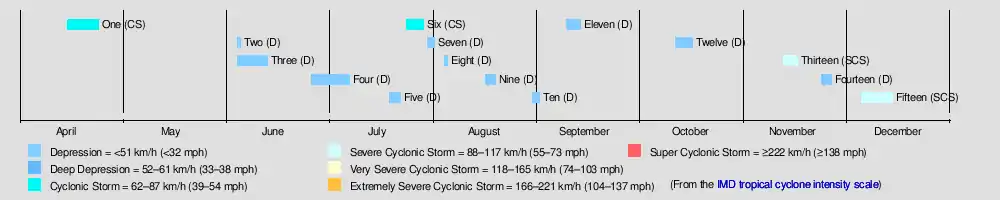 Like in the previous season, most of the storms formed in the season are weak, as four of the fifteen tropical depressions formed intensified to become tropical cyclones. However, unlike the previous season, two severe cyclonic storms formed during the season.[3]