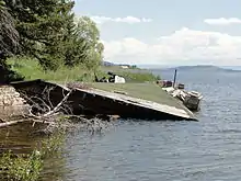 Areas around Hebgen Lake were also affected as the quake caused parts of the lake to rise eight feet (2.4 m). Roads and highways running along the shores of the lake collapsed into the water.[6] In Ennis, most residents were evacuated due to concern Hebgen Lake might flood the town. The evacuation was subsequently called off when it became known the landslide had blocked the river's flow.[14] In West Yellowstone, the earthquake damaged a courthouse[7] and a railroad station.[15]