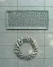 All 13 passengers and 7 crew members on the plane died. 32 people on the ground were killed and 20 were injured.[1] A section of the wing crashed through the roof of a building at Hermann-Lingg-Straße, a block away from the main accident site, without injuring anybody there. The Free Lance-Star, a daily newspaper for Fredricksburg and its surrounding areas, reported that some passengers on the Convair were holiday-bound University of Maryland students who were dependants of military personnel stationed in England.[4]