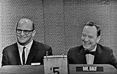 John Charles Daly, the legendary host of What’s My Line, is smiling on his left.