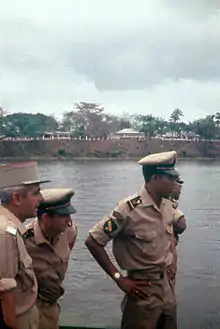 During these events, no gunshots were fired. The public did not react strongly, which, according to the military, was a sign of approval.[43] A provisional government was formed, composed of civilian politicians from the UDSG and BDG such as Philippe N'dong, editor of Gabon's literary review Réalités Gabonaises; Dr. Eloi Chambrier, Gabon's only physician; Philippe Mory, a famous Gabonese actor; and civil servant Paul Gondjout.[44] Mbene stated that the provisional government would not include any members of the M'ba government. He declared that Gabon's pro-French foreign policy would remain unchanged and that Mombo would supervise the government until the presidency was given to Aubame.[41][45] The plotters were content to ensure security for civilians, urging them to remain calm and not hurt anyone.[34] Most of them were junior officers, living in the army barracks. The senior officers did not intervene; instead, they stayed in their "pleasant" houses.[36]