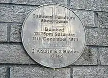 At 12.25 pm on 11 December 1971, when the Shankill Road was packed with Saturday shoppers, a green car pulled up outside the Balmoral Furniture Company at the corner of Carlow Street and Shankill Road.[2] The shop was locally known as "Moffat's" although Balmoral Furniture Company was its official name.[3] One of the occupants got out, leaving a box containing a bomb on the step outside the front door. The person got back into the car and it sped away. The bomb exploded moments later, bringing down most of the building on top of those inside the shop and on passersby outside.[2]