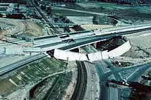 This interchange is a broad complex of overpasses and bridges that was nearly complete at the time of the earthquake and not all portions were open to traffic. Several instances of failure or collapse at the site took place and two men were killed while driving in a pickup truck as a result. The westbound I-210 to southbound I-5, which was complete except for paving at the ramp section, collapsed to the north, likely because of vibration that moved the overpass off its supports due to an inadequate seat. Unlike the situation at the Antelope Valley Interchange, permanent ground movement (defined as several inches of left-lateral displacement with possibly an element of thrusting) was observed in the area. The movement contributed to heavy damage at the Sylmar Juvenile Hall facility, Sylmar Converter Station, and the Metropolitan Water District Treatment Plant, but its effects on the interchange was not completely understood as of a 1971 report from the California Institute of Technology.[25]