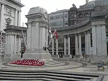 In 2010 the Royal British Legion Oldpark/Cavehill branch in Belfast raised money from the sale of badges to erect a memorial to the men.[20] On 28 May 2010, a memorial stone was placed at the site of the killings on Squire's Hill by the families and former regimental colleagues of the three soldiers. The next day a 15-foot obelisk incorporating carved images of the deceased was dedicated to the soldiers at nearby Ballysillan Avenue. A service of remembrance with regimental drums and colours was then held at Ballysillan leisure centre attended by around 1000 people including Lord Mayor of Belfast Naomi Long and North Belfast MP Nigel Dodds.[21][22]
