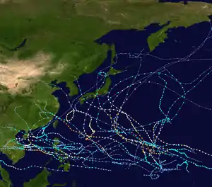 A total of 36 tropical depressions formed this year in the Western Pacific, of which 30 became tropical storms. Twenty-two storms reached typhoon intensity, of which two reached super typhoon strength.[1]
