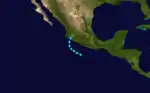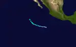 On October 3, an area of disturbed weather was identified several hundred miles southwest of El Salvador. Over the following day, an area of low pressure developed within the disturbance and was subsequently declared a tropical depression. Tracking west-northwestward, the depression eventually intensified into Tropical Storm Patricia on October 6 in light of a significant in convection. The next day, a ragged eye developed and the storm strengthened into a hurricane. Intensification continued through the evening of October 9,[2] at which time Patricia attained its peak intensity with winds estimated at 90 mph (150 km/h).[nb 1][1] Within a day of peaking, the hurricane turned southwestward and weakened. Gradual degradation of the storm took place over the next few days with little convection present over the system by October 11. By then, Patricia had weakened to a tropical depression. On October 15, Patricia was declassified a tropical cyclone as only a low-level circulation devoid of convection remained.[2] The remnants of the storm were last noted on October 17 well to the east-southeast of Hawaii.[6]