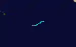 Intensification slowed on August 24 as Ione attained winds in excess of 100 mph (155 km/h). Over the next day, the system turned northward and attained its peak intensity late on August 25 with winds of 115 mph (185 km/h).[7] Additionally, the storm attained an estimated minimum central pressure of 954 mbar (hPa; 28.17 inHg).[1] Shortly after reaching this intensity, Ione weakened as it began a U-shaped curve, tracking northeast before turning towards the southwest. During the afternoon of August 27, the system was downgraded to a tropical storm. By August 29, Ione further weakened to a tropical depression and acquired a westward track before dissipating south of Hawaii on August 31.[7]
