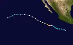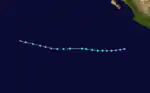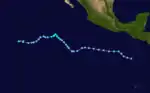 A tropical disturbance was first noted about 345 miles (555 km) south of the Guatemalan coastline on September 27.[2] It organized into Tropical Storm Madeline by 00:00 UTC on September 29 but failed to further develop, instead weakening to a tropical depression the next morning. By 00:00 UTC on October 4, Madeline re-intensified into a tropical storm, beginning a gradual curve toward the north as well. The system continued to strengthen and became a hurricane early on October 6; by 06:00 UTC on October 8, Madline peaked as a Category 4 hurricane with winds of 145 mph (235 km/h). It moved onshore the coastline of Mexico a few hours later, rapidly weakening and losing its status as a tropical cyclone after 18:00 UTC that day.[3]