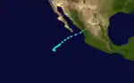 The deadliest and most destructive hurricane of the 1976 season originated as a large tropical disturbance about 525 miles (845 km) southwest of Acapulco, Guerrero, on September 25.[2] It developed into a tropical depression around 18:00 UTC that day and steadily strengthened into Tropical Storm Liza 24 hours later.[3] The incipient cyclone turned toward the north while continuing over warm waters,[2] and it attained hurricane strength by 00:00 UTC on September 28. Liza intensified into a major hurricane on September 29,[3] and a reconnaissance aircraft measured peak winds of 140 mph (220 km/h) around 18:00 UTC, when the storm was in the midst of an eyewall replacement cycle.[2] Liza maintained Category 4 intensity until early on October 1 when it moved ashore the coastline of Mexico north of Los Mochis, Sinaloa, as a slighter weaker Category 3 cyclone. Liza rapidly weakened over the mountainous terrain and was last tracked as a tropical cyclone at 12:00 UTC on October 1.[2][3]