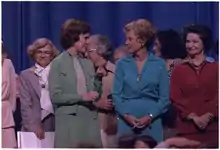 Rosalynn Carter, who was First Lady when the conference took place, was a strong proponent of feminism and the Equal Rights Amendment. She was the first First Lady to use the office in the East Wing, and was a known advocate for several social issues such as mental health and services for senior citizens.[33] She attended the conference with Johnson and Ford, stating that Ford was the major force in bringing them all together.[34] The First Ladies all delivered speeches during the opening ceremony and accepted the torch when it arrived onstage.