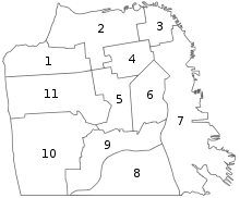 In 1980, districts were abolished and replaced by the original city-at-large slate for future elections; electoral districts were only revived beginning with the 2000 elections.