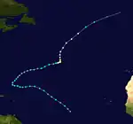 A tropical wave passed westward across Dakar, Senegal on August 31 and entered the Atlantic Ocean later that day. Convection markedly increased over the next few days and by 0000 UTC on September 4, the wave developed into a tropical depression while located about midway between Africa and the Lesser Antilles. Later that day, the Hong Kong Merchant reported tropical storm force winds, thus the depression was upgraded to Tropical Storm Flossie. It initially tracked northwestward at 23 mph (37 km/h) and minimal strengthening occurred, possibly due to rapid forward speeds. On September 5, the storm curved westward, until turning north on September 7. A high-pressure area transitioned into a trough, causing Flossie to re-curve northeastward and generating strong upper-level winds.[46]