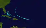 Late on January 21, the outer rainbands to the south and east of the center began diminishing, which began a weakening trend after the storm maintained peak winds for about 36 hours.[12] At around that time, the cyclone was moving west-southwestward, and within 72 hours was forecast by one hurricane forecast model to be located over Hispaniola.[13] By midday on January 22, the winds decreased to below gale force after the convection dissipated near the center.[14] Subsequently, it turned more to the west away from land, and by January 23 the circulation degenerated into a remnant trough about 185 mi (298 km) north of the Lesser Antilles.[2] The storm was one of six tropical or subtropical cyclones on record in the month of January, and one of four to have formed in the month.[15]