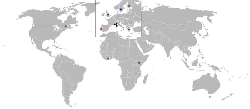 | Black = Tarmac | Brown = Gravel | Blue = Snow/ice | Red = Mixed surface |