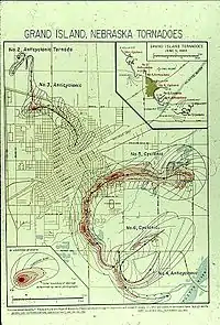 | F4 | Grand Island | Hall | NE | 40.92°N 98.3°W | 0316–0328 | 1.1 mi (1.8 km) | 1,700 yd (1,600 m) | 3 deaths – Fifth of seven tornadoes to hit the city in just over two hours. Tornado touched down just east of Grand Island, then moved west into the city. Once within the city, the tornado turned south and followed Locust Street, causing some of the most intense damage of the outbreak to businesses and neighboring residences, some of which were "obliterated". Numerous homes, vehicles, businesses, trees, and power lines were destroyed. Damages exceeded $200 million, and 110 people were injured. While the path length is listed as 1.1 miles (1.8 km), the curving path of the tornado covered a distance of 6 miles (9.7 km).[3][4] |