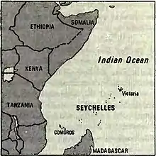 The Republic of Seychelles achieved independence on 29 June 1976. James Mancham was president and France-Albert René was prime minister, but relations between the two quickly soured. In 1977 René's leftist supporters launched an armed coup while Mancham was in London. Though René denied any responsibility, he assumed the presidency in June. Being a member of the Non-Aligned Movement, the René presidency was considered by the United States to be Marxist in its outlook and favourably disposed towards the Soviet Union.[2] This lead to a US initiated attempted plot against his government in 1979 - the plot was uncovered and resulted in the expulsion of several of the 120 American civilians working at a USAF Satellite Tracking Facility on the main island of Mahe (for economic reasons the station was permitted to remain operational - but the terms of lease were re-negotiated to be more equitable towards the Seychelles). The US Ambassador to Kenya as well as the Charge 'd Affaires in the Seychelles were also implicated in the coup.[3]