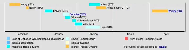 During the season, the Réunion Meteorological Service tracked storms in the basin, using the Dvorak technique to estimate tropical cyclone intensities via satellite imagery.[1] The agency later became Météo-France's meteorological office at Réunion (MFR). At the time, the basin extended from the east coast of Africa to 80° E.[2] Eleven storms were named by the Mauritius Meteorological Service and the Madagascar Meteorological Service.[1] The rest of the naming list was Lalao, Monja, Nora, Olidera, Pelazy, Rija, Saholy, Tsira, Vaosolo, Wilfredy, Yannika, and Zozo.[3] The 11 named storms were slightly above the normal of 9, most of which formed in January and February. There were four intense tropical cyclones, which is twice the average. The increased activity of the season was in part due to enhanced easterlies, a strong monsoon trough, and warm water temperatures around 28 °C (82 °F) which extended to 25° S.[4]