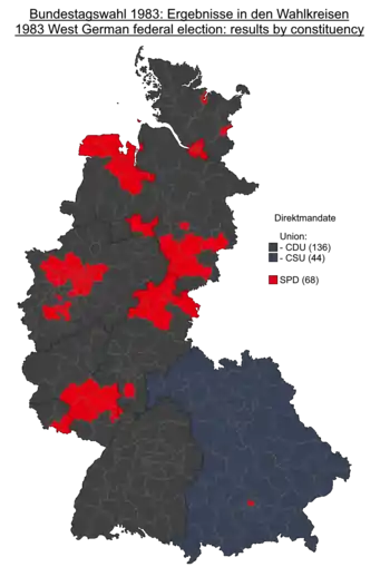 ![]() Results by constituency for the first votes. Grey denotes seats won by the CDU/CSU; red denotes seats won by the SPD. | |||||||||||||||||||||||||||||||||||||||||||||||||||||||||||||||||||||||