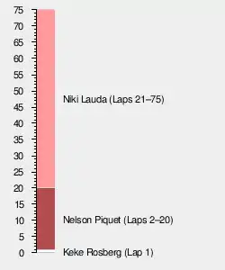 Keke Rosberg 1 (1), Nelson Piquet 19 (2–20), Niki Lauda 55 (21–75).