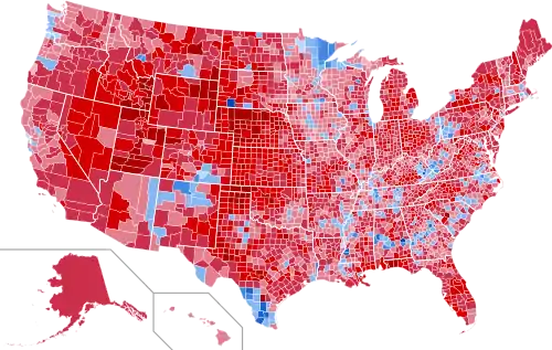 Reagan won a landslide re-election victory, carrying 49 of the 50 states, making this the second election in the 20th century in which a party won 49 states. Mondale won only his home state of Minnesota with a 0.18% margin, and the District of Columbia.[3] Reagan won 525 of the 538 electoral votes, the most of any presidential candidate in U.S. history.[4] In terms of electoral votes, this was the second-most lopsided presidential election in modern U.S. history; Franklin D. Roosevelt's 1936 victory over Alf Landon, in which he won 98.5 percent or 523 of the then-total 531 electoral votes, ranks first.[5] Reagan won 58.8 percent of the popular vote to Mondale's 40.6 percent. His popular vote margin of victory—nearly 16.9 million votes (54.4 million for Reagan to 37.5 million for Mondale)[6][7]—was exceeded only by Richard Nixon in his 1972 victory over George McGovern.[3] Reagan was also the first president since Dwight D. Eisenhower to be re-elected while winning absolute popular vote majorities in both of his presidential campaigns. At the age of 73, Reagan was, at that point, the oldest person ever elected president. He was surpassed by Joe Biden, then aged 77, in the 2020 presidential election.