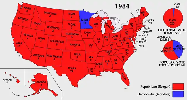 ![]() Presidential election results map. Red denotes states won by Reagan/Bush and blue denotes those won by Mondale/Ferraro. Numbers indicate electoral votes cast by each state and the District of Columbia. | |||||||||||||||||||||||||||||