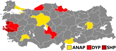The governing Motherland Party (ANAP) won the most votes, winning 32.1% of the vote and 6 of the 11 seats up for election. The newly formed True Path Party (DYP) led by Hüsamettin Cindoruk came second with 23.5% and won 4 seats. Since ANAP and the DYP were both centre-right parties, their campaigns caused a vote split, which resulted in a reduction in the popular vote of the ANAP since the 1983 general election. The Social Democratic Populist Party (SHP) came third with 22.7% and won the remaining seat, with the party's leader Erdal İnönü becoming an MP for İzmir.[1] All provinces elected a single MP apart from Manisa, where two MPs were elected. In addition to İnönü, the leader of the DYP Hüsamettin Cindoruk was also elected as an MP for Zonguldak.