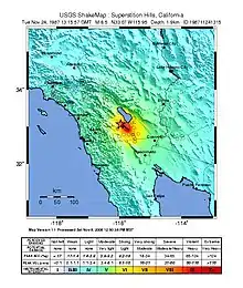 The 1987 Superstition Hills earthquakes were a pair of earthquakes Mw 6.2 and 6.6 that rattled the Imperial Valley of California. The earthquakes caused damage to places in California and Mexico, and was felt as far as Las Vegas and Phoenix. Both main shocks were larger than the deadly earthquake that struck Los Angeles on October 1, which was a magnitude 5.9.[1]