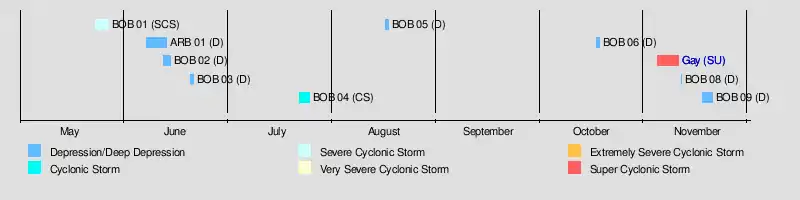 Throughout the season, the IMD monitored ten depressions, three of which became cyclonic storms.[3] The strongest storm of the year was Super Cyclonic Storm Gay. Crossing the Malay Peninsula into the Bay of Bengal on November 4, Gay became one of the most powerful systems on record in the basin, attaining an estimated pressure of 930 mbar (hPa; 27.46 inHg). Collectively, the storms were responsible for at least 1,785 fatalities, 1,445 of which were due to the disastrous flooding triggered by the July Cyclonic Storm, and more than $25 million in damage.