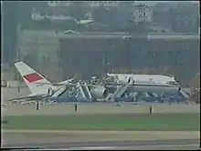 Moments before landing, Jiang managed to wrestle control of the aircraft from the pilot. The 737 landed at an excessive speed, and sideswiped a parked China Southwest Airlines Boeing 707-3J6B which had just arrived from Chengdu as China Southwest Airlines Flight 4305, slightly injuring the pilot, who was in the cockpit at the time.[6] Still unable to stop, the out-of-control 737 collided with China Southern Airlines Flight 3523,[7] a Boeing 757[8] waiting to depart to Shanghai, before flipping over onto its back and skidding to a halt.[9]