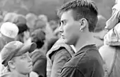 In the mid 1990s, men's hairstyle trends went in several different directions. Younger men who were more amenable had adopted the Caesar cut,[122] either natural or dyed. This style was popularized by George Clooney[123] on the hit TV show ER in season two, which premiered in mid 1995. More rebellious young men went for longer, unkempt "grunge" hair,[121] often with a center parting. The curtained hairstyle was at its peak in popularity, and sideburns went out of style.[124] Meanwhile, most professional men over 30 had conservative 1950s style bouffant haircuts or the Caesar cut.[121]