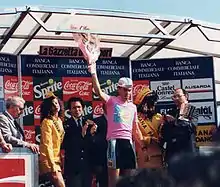 The nineteenth leg featured only one categorized climb, which Iñaki Gastón won to seal his victory in the mountains classification.[45] The stage saw no major time disparities in the general classification contenders as they finished together, with Bugno taking the stage win.[45] The penultimate stage of the race was a 66 km (41 mi) individual time trial that contained one un-categorized climb within the route.[46] Race leader Chioccioli took the course and at the first time check at 15.5 km (10 mi) he had already put thirty seconds into Bugno.[46] He ended up winning the stage by fifty-seconds over Bugno, thereby extending his lead over the rest of his competitors.[46] The final stage culminated with a bunch sprint that was won by Cipollini.[47] Chioccioli had won the Giro d'Italia for the first time by almost four minutes over the second-place finisher Chiappucci.[48][49][50]
