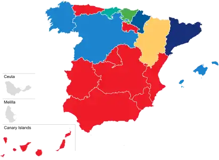 The following table lists party control in autonomous communities. Gains for a party are highlighted in that party's colour.
