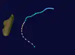 The ITCZ spawned an area of convection on January 11 near the Chagos Archipelago. A circulation developed within the system on January 13 about 400 km (250 mi) southwest of Diego Garcia, and at that time it became a tropical disturbance. A large ridge to the south steered the system generally to the southwest. The disturbance intensified into a depression on January 14,[4] the same date that the JTWC initiated advisories on Tropical Cyclone 10S,[6] and following an increase in convection, the depression intensified into Moderate Tropical Storm Colina on January 15. Turning more to the south-southwest, Colina strengthened further into a tropical cyclone on January 18, developing a 30 km (19 mi) eye.[4] On the next day, the cyclone attained peak 10-minute winds of 135 km/h (85 mph), according to MFR, while the JTWC estimated peak 1-minute winds of 175 km/h (110 mph).[10] That day, the eye crossed over the western portion of Réunion at around 14:30 UTC, exiting 45 minutes later. Subsequently, Colina accelerated to the southeast over cooler waters, weakening in the process. On December 20, the cyclone weakened to tropical storm status, and the next day Colina became extratropical, dissipating two days later.[4]