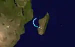 A large low pressure area persisted on February 11 across northern Madagascar, centered near Cape Masoala along the country's eastern coast. Moving southward and later southeastward due to a trough, the system developed into a tropical disturbance on February 12 and slowly organized.[4] On the next day, the JTWC began tracking the system as Tropical Cyclone 19S.[6] The MFR upgraded the system to Tropical Storm Finella on February 14 after an eye feature developed within the central dense overcast.[4] As a result, the JTWC upgraded the system to the equivalent of a minimal hurricane that day, estimating peak 1-minute winds of 130 km/h (85 mph), although the MFR only estimated peak 10-minute winds of 80 km/h (50 mph).[14] Increased wind shear weakened Finella, and it was no longer a tropical depression on February 15.[4]