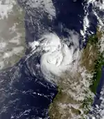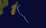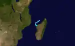 The ITCZ remained active in early March, spawning a tropical depression in the northern Mozambique Channel on March 2. It failed to organize at first, although an increase in convection on March 3 allowed the system to strengthen into Tropical Storm Ionia.[4] That day, it attained peak winds of 65 km/h (40 mph).[16] After passing about 50 km (30 mi) north of Juan de Nova island, Ionia progressed southeastward and approached the western Madagascar coastline. The circulation paralleled the coast for about 250 km (160 mi) before moving ashore at Belo on March 4. The storm weakened over land, re-emerging over open waters on March 5 from southeastern Madagascar. Ionia briefly re-intensified into a tropical depression that night,[4] but it lost tropical characteristics on March 7.[16] The remnants persisted several more days until dissipating south of the Mascarene Islands on March 11.[4]