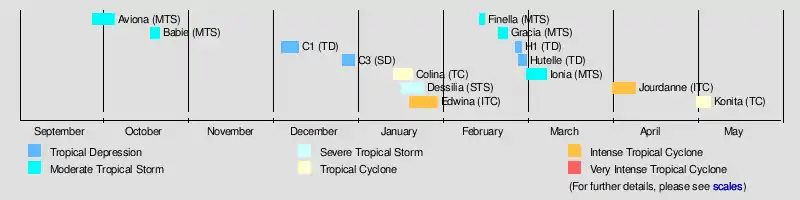During the season, the Météo-France office (MFR) on Réunion island issued warnings in tropical cyclones within the basin. The agency estimated intensity through the Dvorak technique,[4] and warned on tropical cyclones in the region from the coast of Africa to 90° E, south of the equator.[5] The Joint Typhoon Warning Center (JTWC), which is a joint United States Navy – United States Air Force task force, also issued tropical cyclone warnings for the southwestern Indian Ocean.[6] The storms in the season lasted about five days on average, although Cyclone Edwina lasted the longest at 11 days. Storms formed throughout the basin and were fairly evenly distributed throughout the season, with the exception of a lull in November. Most storms originated from the Intertropical Convergence Zone (ITCZ). MFR named storms throughout the season using 11 names from a sequential list.[4] The remainder of the list was Laura, Monette, Neige, Octavie, Pamela, Rosita, Stella, Tasiana, Vigonia, Wendy, and Yolande.[7]