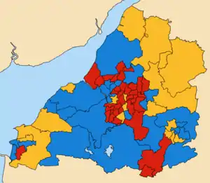 ![]() Map showing the composition of Avon County Council following the election. Blue showing Conservative, Red showing Labour and yellow showing Liberal Democrats. | |||||||||||||||||||||||||||||||||||||||||||||||||||||